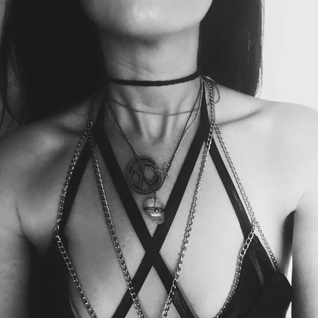 A ECHOWEAR logo necklace with Chrystal, chain harness, and black top from “BLACK SET”
