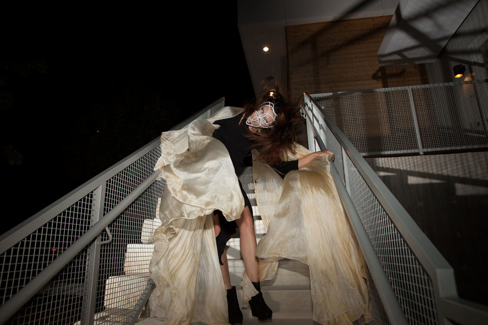 A ECHOWEAR logo necklace with Chrystal, chain harness, and black top from “BLACK SET”